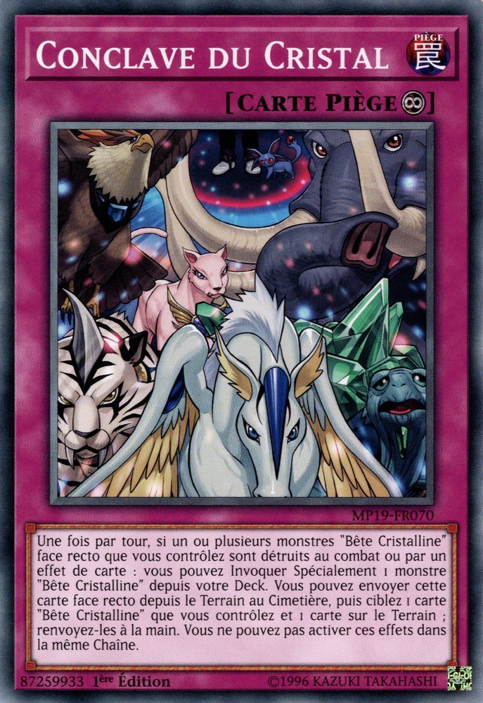Une fois par tour, si un ou plusieurs monstres "Bête Cristalline" face recto que vous contrôlez sont détruits au combat ou par un effet de carte : vous pouvez Invoquer Spécialement 1 monstre "Bête Cristalline" depuis votre Deck. Vous pouvez envoyer cette carte face recto depuis le Terrain au Cimetière, puis ciblez 1 carte "Bête Cristalline" que vous contrôlez et 1 carte sur le Terrain ; renvoyez-les à la main. Vous ne pouvez pas activer ces effets dans la même Chaîne.