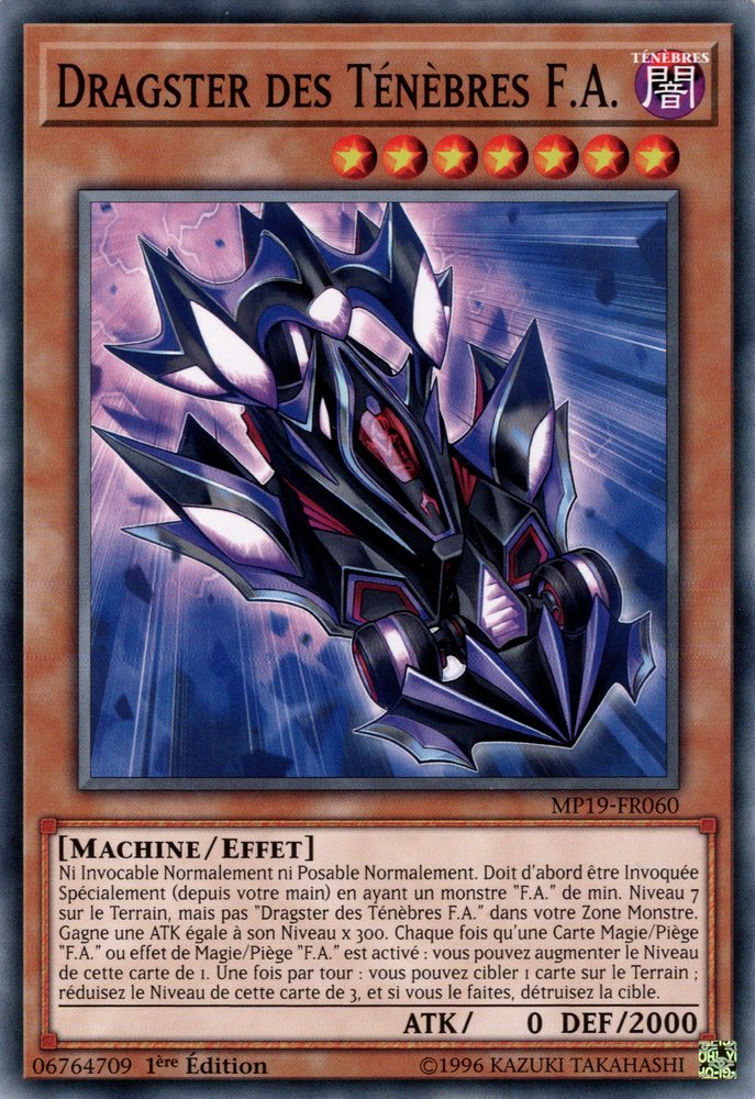 Ni Invocable Normalement ni Posable Normalement. Doit d'abord être Invoquée Spécialement (depuis votre main) en ayant un monstre "F.A." de min. Niveau 7 sur le Terrain, mais pas "Dragster des Ténèbres F.A." dans votre Zone Monstre. Gagne une ATK égale à son Niveau x 300. Chaque fois qu'une Carte Magie/Piège "F.A." ou effet de Magie/Piège "F.A." est activé : vous pouvez augmenter le Niveau de cette carte de 1. Une fois par tour : vous pouvez cibler 1 carte sur le Terrain ; réduisez le Niveau de cette carte de 3, et si vous le faites, détruisez la cible.