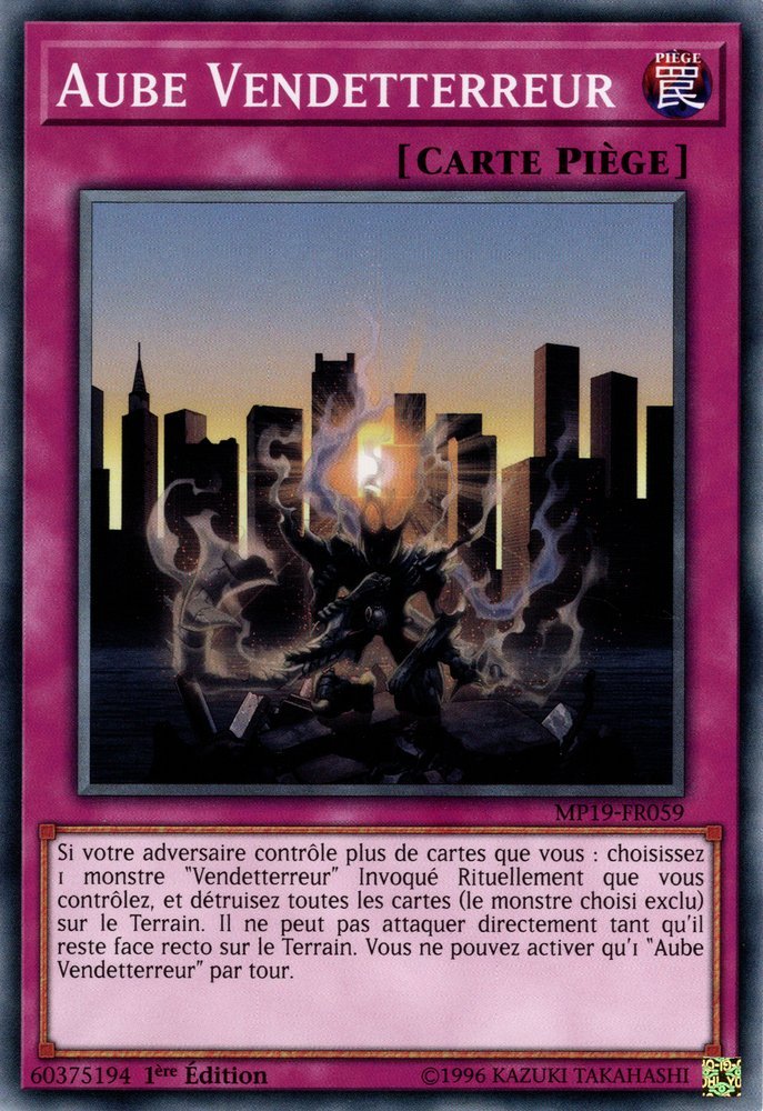 Si votre adversaire contrôle plus de cartes que vous : choisissez 1 monstre "Vendetterreur" Invoqué Rituellement que vous contrôlez, et détruisez toutes les cartes (le monstre choisi exclu) sur le Terrain. Il ne peut pas attaquer directement tant qu'il reste face recto sur le Terrain. Vous ne pouvez activer qu'1 "Aube Vendetterreur" par tour.