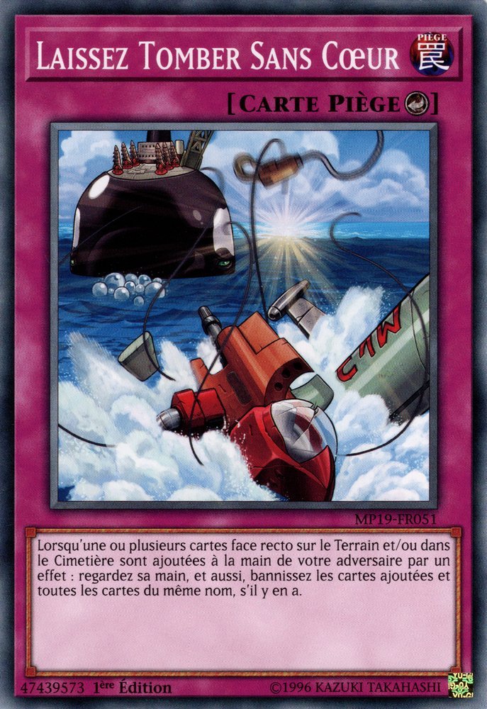Lorsqu'une ou plusieurs cartes face recto sur le Terrain et/ou dans le Cimetière sont ajoutées à la main de votre adversaire par un effet : regardez sa main, et aussi, bannissez les cartes ajoutées et toutes les cartes du même nom, s'il y en a.