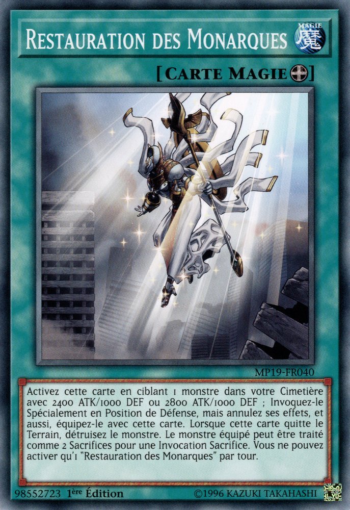Activez cette carte en ciblant 1 monstre dans votre Cimetière avec 2400 ATK/1000 DEF ou 2800 ATK/1000 DEF ; Invoquez-le Spécialement en Position de Défense, mais annulez ses effets, et aussi, équipez-le avec cette carte. Lorsque cette carte quitte le Terrain, détruisez le monstre. Le monstre équipé peut être traité comme 2 Sacrifices pour une Invocation Sacrifice. Vous ne pouvez activer qu'1 "Restauration des Monarques" par tour.