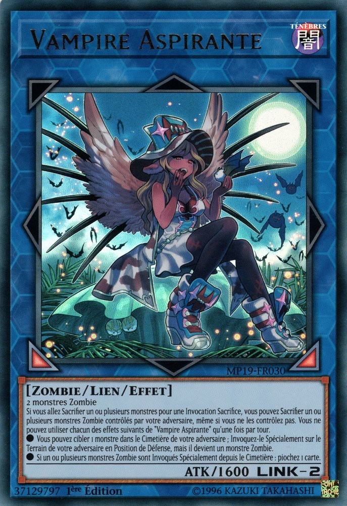 2 monstres Zombie Si vous allez Sacrifier un ou plusieurs monstres pour une Invocation Sacrifice, vous pouvez Sacrifier un ou plusieurs monstres Zombie contrôlés par votre adversaire, même si vous ne les contrôlez pas. Vous ne pouvez utiliser chacun des effets suivants de "Vampire Aspirante" qu'une fois par tour. ?Vous pouvez cibler 1 monstre dans le Cimetière de votre adversaire ; Invoquez-le Spécialement sur le Terrain de votre adversaire en Position de Défense, mais il devient un monstre Zombie. ?Si un ou plusieurs monstres Zombie sont Invoqués Spécialement depuis le Cimetière : piochez 1 carte.