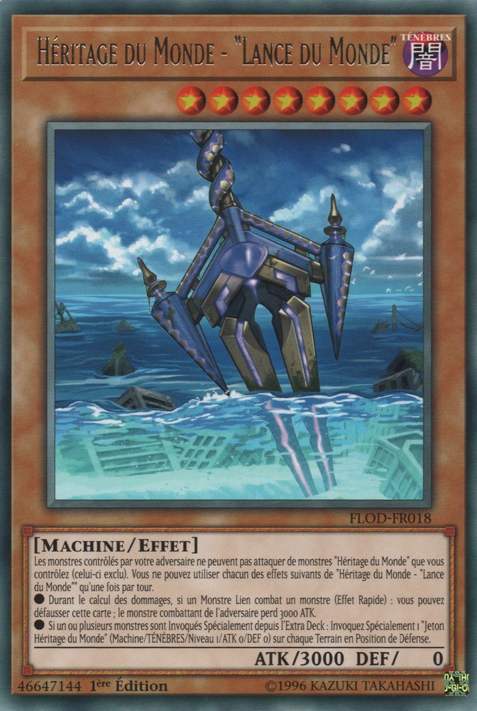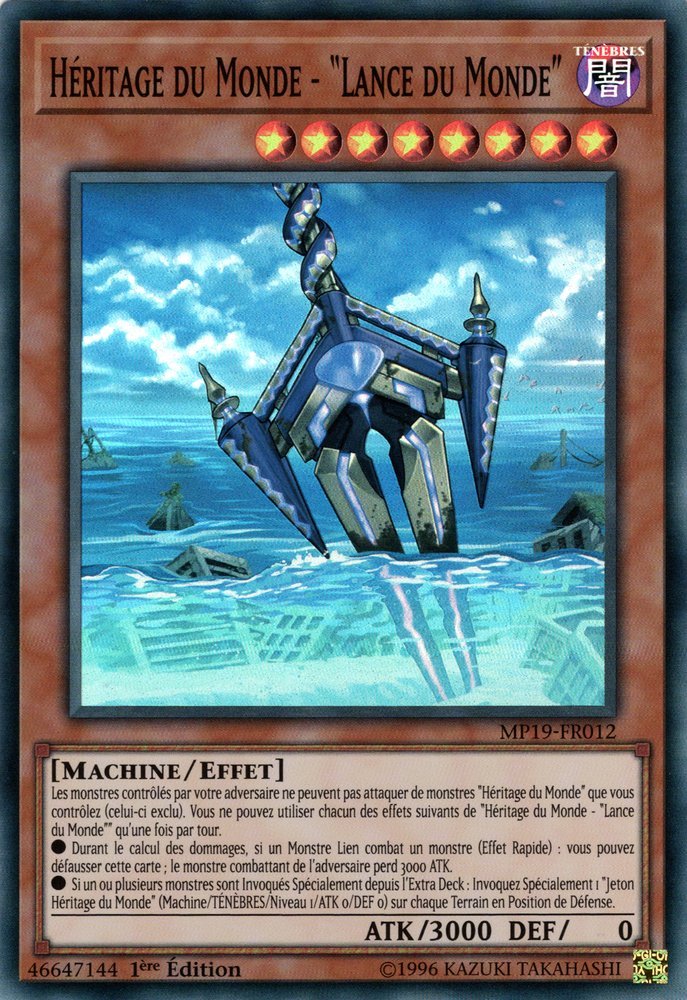 Les monstres contrôlés par votre adversaire ne peuvent pas attaquer de monstres "Héritage du Monde" que vous contrôlez (celui-ci exclu). Vous ne pouvez utiliser chacun des effets suivants de "Héritage du Monde - "Lance du Monde"" qu'une fois par tour. ?Durant le calcul des dommages, si un Monstre Lien combat un monstre (Effet Rapide) : vous pouvez défausser cette carte ; le monstre combattant de l'adversaire perd 3000 ATK. ?Si un ou plusieurs monstres sont Invoqués Spécialement depuis l'Extra Deck : Invoquez Spécialement 1 "Jeton Héritage du Monde" (Machine/TÉNÈBRES/Niveau 1/ATK 0/DEF 0) sur chaque Terrain en Position de Défense.
