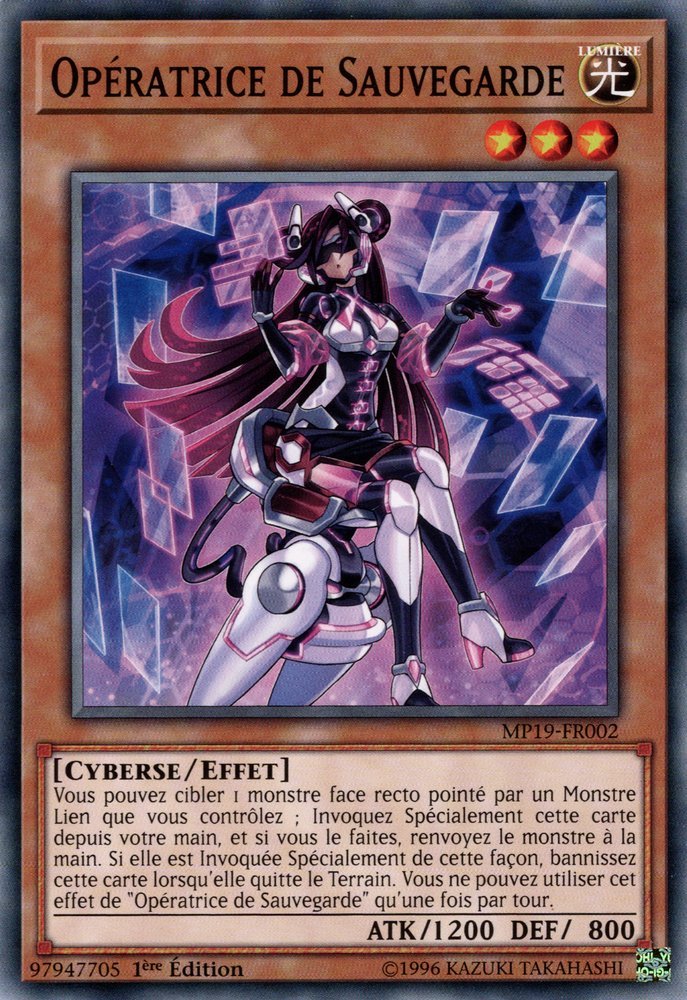 Vous pouvez cibler 1 monstre face recto pointé par un Monstre Lien que vous contrôlez ; Invoquez Spécialement cette carte depuis votre main, et si vous le faites, renvoyez le monstre à la main. Si elle est Invoquée Spécialement de cette façon, bannissez cette carte lorsqu'elle quitte le Terrain. Vous ne pouvez utiliser cet effet de "Opératrice de Sauvegarde" qu'une fois par tour.