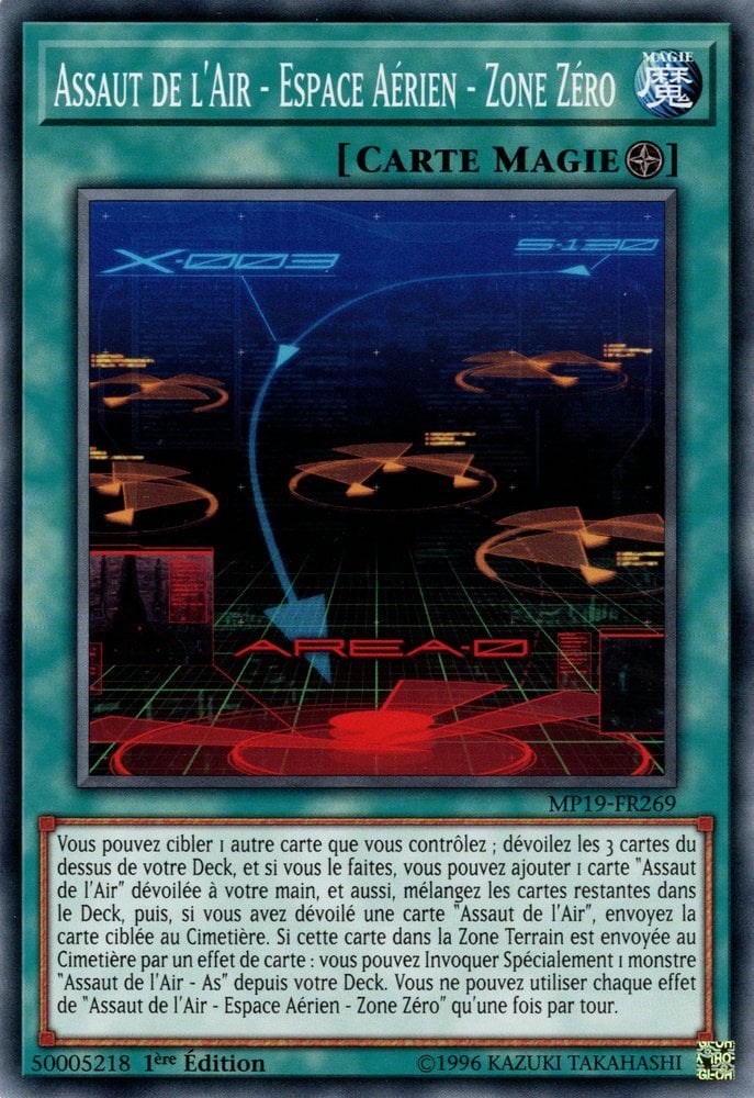 Vous pouvez cibler 1 autre carte que vous contrôlez ; dévoilez les 3 cartes du dessus de votre Deck, et si vous le faites, vous pouvez ajouter 1 carte "Assaut de l'Air" dévoilée à votre main, et aussi, mélangez les cartes restantes dans le Deck, puis, si vous avez dévoilé une carte "Assaut de l'Air", envoyez la carte ciblée au Cimetière. Si cette carte dans la Zone Terrain est envoyée au Cimetière par un effet de carte : vous pouvez Invoquer Spécialement 1 monstre "Assaut de l'Air - As" depuis votre Deck. Vous ne pouvez utiliser chaque effet de "Assaut de l'Air - Espace Aérien - Zone Zéro" qu'une fois par tour.