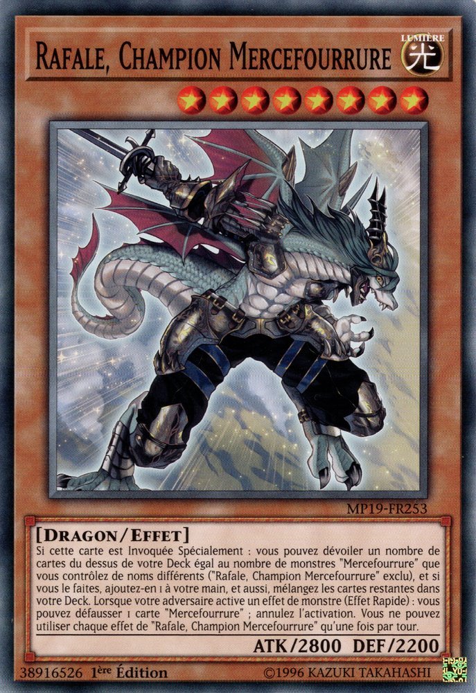 Si cette carte est Invoquée Spécialement : vous pouvez dévoiler un nombre de cartes du dessus de votre Deck égal au nombre de monstres "Mercefourrure" que vous contrôlez de noms différents ("Rafale, Champion Mercefourrure" exclu), et si vous le faites, ajoutez-en 1 à votre main, et aussi, mélangez les cartes restantes dans votre Deck. Lorsque votre adversaire active un effet de monstre (Effet Rapide) : vous pouvez défausser 1 carte "Mercefourrure" ; annulez l'activation. Vous ne pouvez utiliser chaque effet de "Rafale, Champion Mercefourrure" qu'une fois par tour.