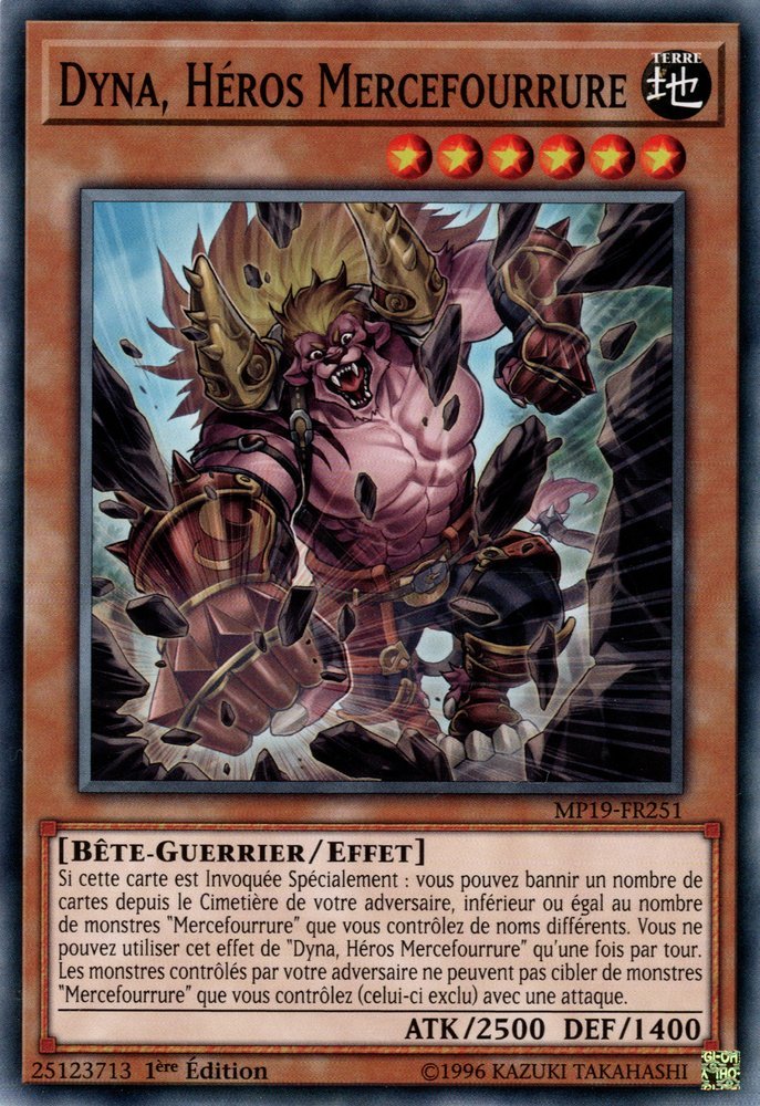 Si cette carte est Invoquée Spécialement : vous pouvez bannir un nombre de cartes depuis le Cimetière de votre adversaire, inférieur ou égal au nombre de monstres "Mercefourrure" que vous contrôlez de noms différents. Vous ne pouvez utiliser cet effet de "Dyna, Héros Mercefourrure" qu'une fois par tour. Les monstres contrôlés par votre adversaire ne peuvent pas cibler de monstres "Mercefourrure" que vous contrôlez (celui-ci exclu) avec une attaque.