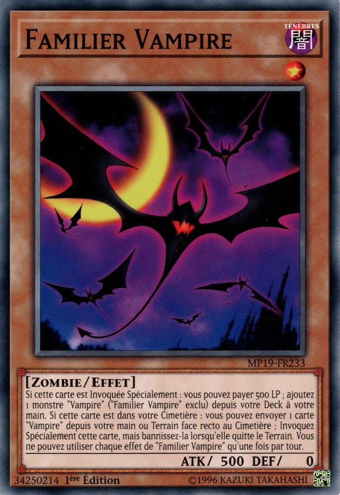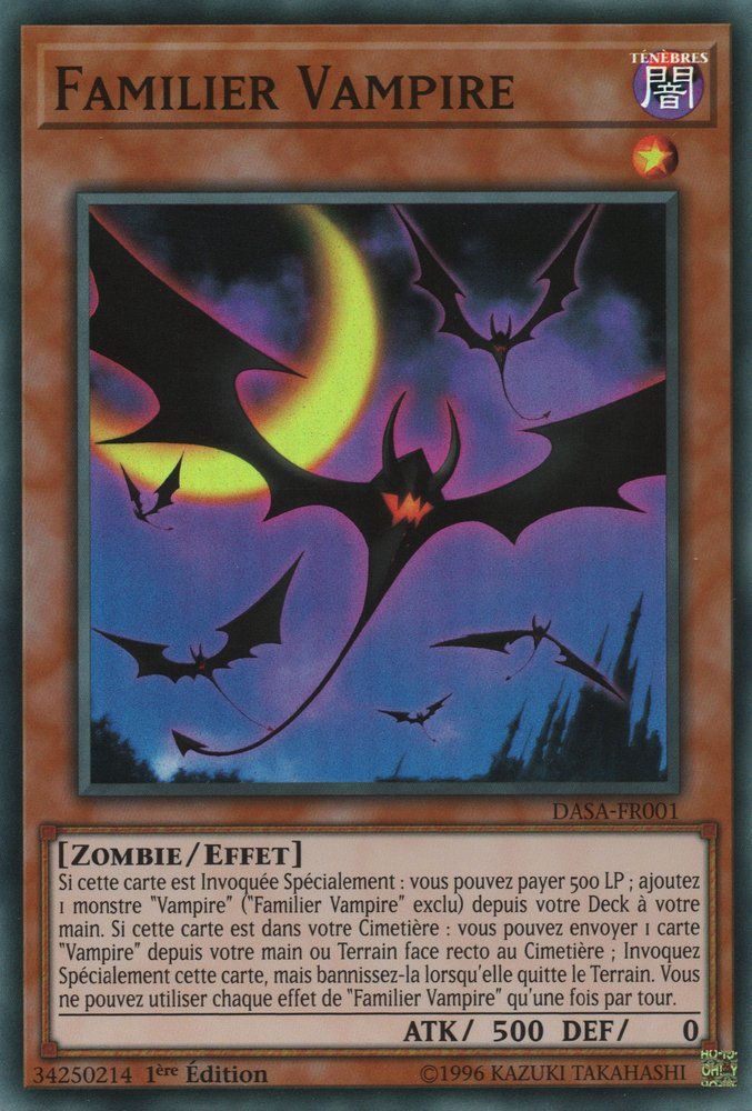 Si cette carte est Invoquée Spécialement : vous pouvez payer 500 LP ; ajoutez 1 monstre "Vampire" ("Familier Vampire" exclu) depuis votre Deck à votre main. Si cette carte est dans votre Cimetière : vous pouvez envoyer 1 carte "Vampire" depuis votre main ou Terrain face recto au Cimetière ; Invoquez Spécialement cette carte, mais bannissez-la lorsqu'elle quitte le Terrain. Vous ne pouvez utiliser chaque effet de "Familier Vampire" qu'une fois par tour.