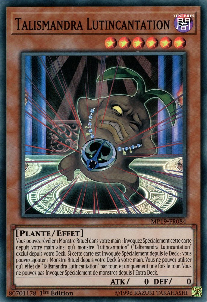 Vous pouvez révéler 1 Monstre Rituel dans votre main ; Invoquez Spécialement cette carte depuis votre main ainsi qu'1 monstre "Lutincantation" ("Talismandra Lutincantation" exclu) depuis votre Deck. Si cette carte est Invoquée Spécialement depuis le Deck : vous pouvez ajouter 1 Monstre Rituel depuis votre Deck à votre main. Vous ne pouvez utiliser qu'1 effet de "Talismandra Lutincantation" par tour, et uniquement une fois le tour. Vous ne pouvez pas Invoquer Spécialement de monstres depuis l'Extra Deck.