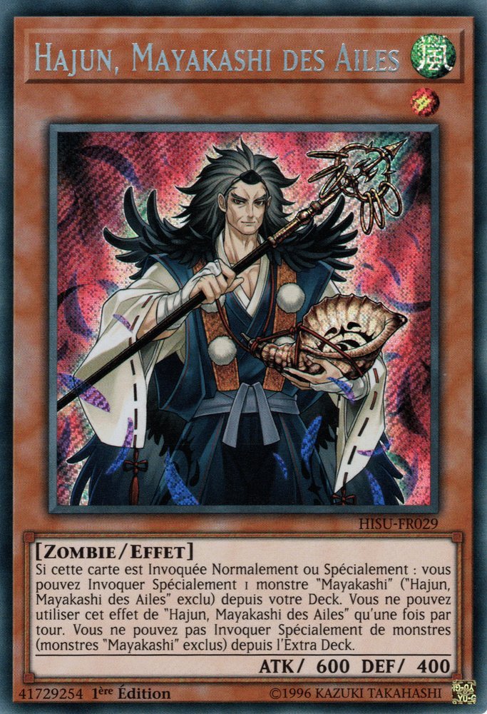 Si cette carte est Invoquée Normalement ou Spécialement : vous pouvez Invoquer Spécialement 1 monstre "Mayakashi" ("Hajun, Mayakashi des Ailes" exclu) depuis votre Deck. Vous ne pouvez utiliser cet effet de "Hajun, Mayakashi des Ailes" qu'une fois par tour. Vous ne pouvez pas Invoquer Spécialement de monstres (monstres "Mayakashi" exclus) depuis l'Extra Deck.
