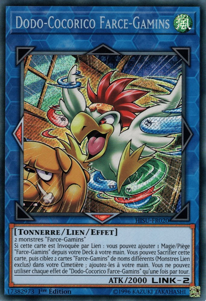 2 monstres "Farce-Gamins" Si cette carte est Invoquée par Lien : vous pouvez ajouter 1 Magie/Piège "Farce-Gamins" depuis votre Deck à votre main. Vous pouvez Sacrifier cette carte, puis ciblez 2 cartes "Farce-Gamins" de noms différents (Monstres Lien exclus) dans votre Cimetière ; ajoutez-les à votre main. Vous ne pouvez utiliser chaque effet de "Dodo-Cocorico Farce-Gamins" qu'une fois par tour.