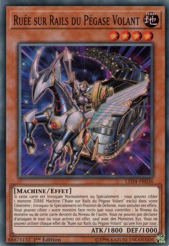 Si cette carte est Invoquée Normalement ou Spécialement : vous pouvez cibler 1 monstre TERRE Machine ("Ruée sur Rails du Pégase Volant" exclu) dans votre Cimetière ; Invoquez-le Spécialement en Position de Défense, mais annulez ses effets. Vous pouvez cibler 1 autre monstre face recto que vous contrôlez ; le Niveau du monstre ou de cette carte devient du Niveau de l'autre. Vous ne pouvez pas déclarer d'attaques le tour où vous activez cet effet, sauf avec des Monstres Xyz. Vous ne pouvez utiliser chaque effet de "Ruée sur Rails du Pégase Volant" qu'une fois par tour.