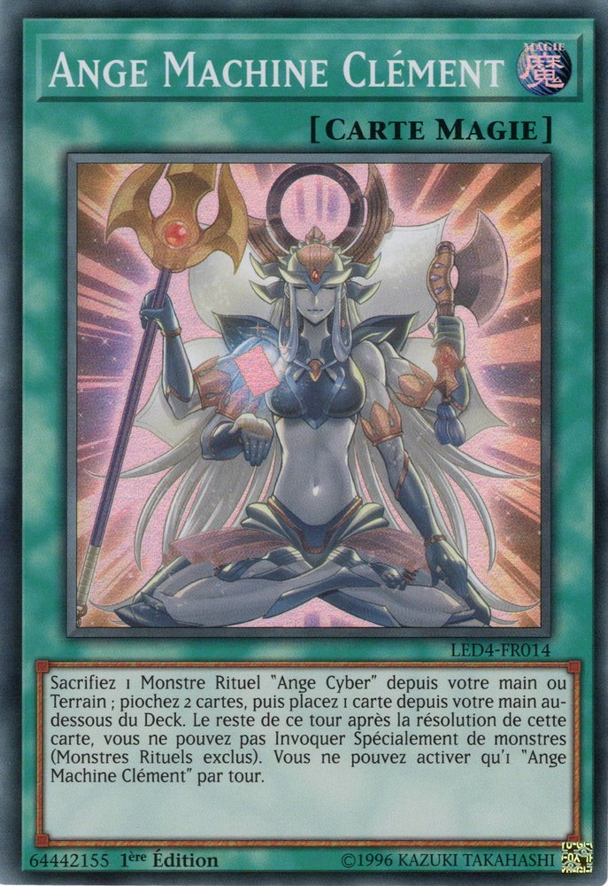Sacrifiez 1 Monstre Rituel "Ange Cyber" depuis votre main ou Terrain ; piochez 2 cartes, puis placez 1 carte depuis votre main au-dessous du Deck. Le reste de ce tour après la résolution de cette carte, vous ne pouvez pas Invoquer Spécialement de monstres (Monstres Rituels exclus). Vous ne pouvez activer qu'1 "Ange Machine Clément" par tour.
