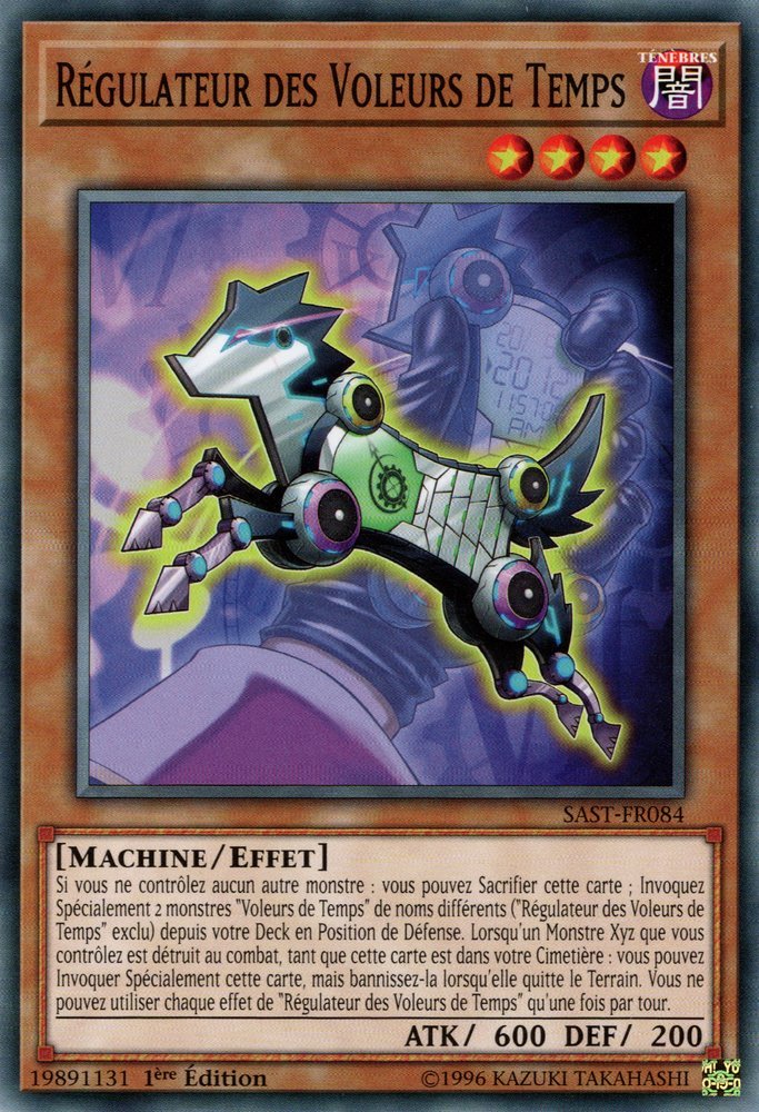 Si vous ne contrôlez aucun autre monstre : vous pouvez Sacrifier cette carte ; Invoquez Spécialement 2 monstres "Voleurs de Temps" de noms différents ("Régulateur des Voleurs de Temps" exclu) depuis votre Deck en Position de Défense. Lorsqu'un Monstre Xyz que vous contrôlez est détruit au combat, tant que cette carte est dans votre Cimetière : vous pouvez Invoquer Spécialement cette carte, mais bannissez-la lorsqu'elle quitte le Terrain. Vous ne pouvez utiliser chaque effet de "Régulateur des Voleurs de Temps" qu'une fois par tour.