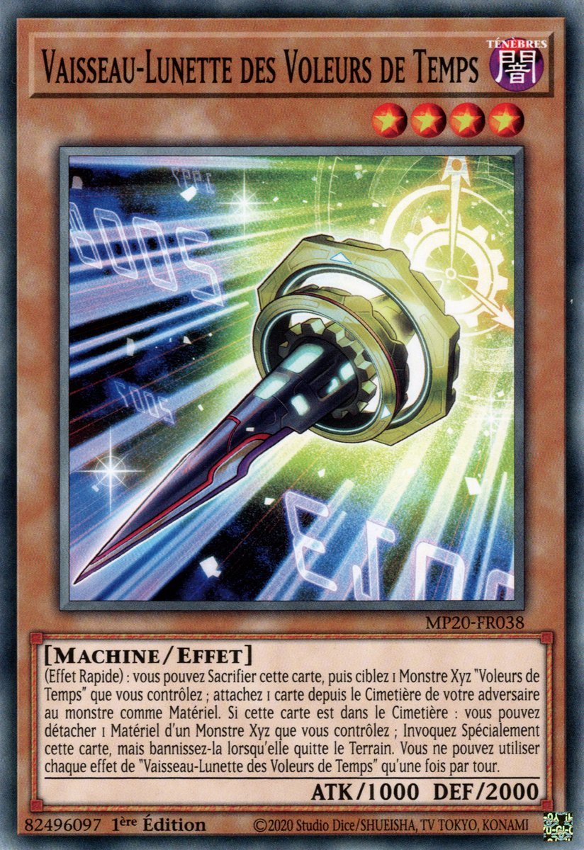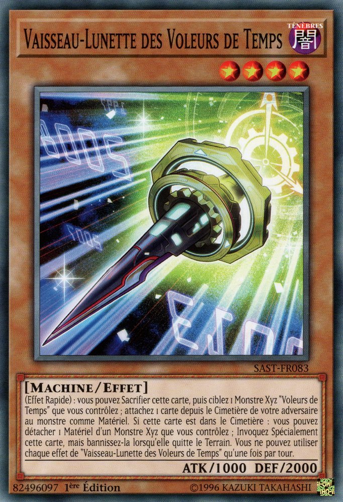 (Effet Rapide) : vous pouvez Sacrifier cette carte, puis ciblez 1 Monstre Xyz "Voleurs de Temps" que vous contrôlez ; attachez 1 carte depuis le Cimetière de votre adversaire au monstre comme Matériel. Si cette carte est dans le Cimetière : vous pouvez détacher 1 Matériel d'un Monstre Xyz que vous contrôlez ; Invoquez Spécialement cette carte, mais bannissez-la lorsqu'elle quitte le Terrain. Vous ne pouvez utiliser chaque effet de "Vaisseau-Lunette des Voleurs de Temps" qu'une fois par tour.