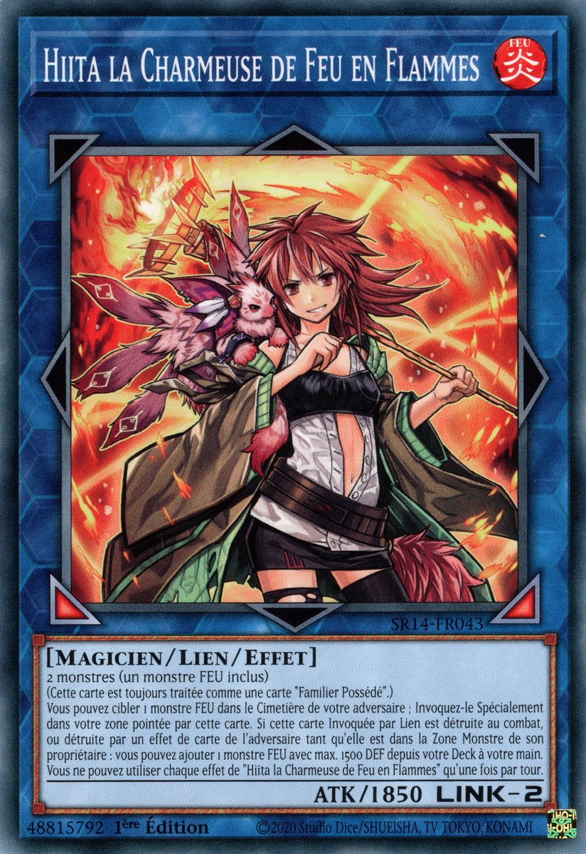 2 monsters, including a FIRE monster (This card is always treated as a "Familiar-Possessed" card.) You can target 1 FIRE monster in your opponent's GY; Special Summon it to your zone this card points to. If this Link Summoned card is destroyed by battle, or is destroyed by an opponent's card effect while in its owner's Monster Zone: You can add 1 FIRE monster with 1500 or less DEF from your Deck to your hand. You can only use each effect of "Hiita the Fire Charmer, Ablaze" once per turn.