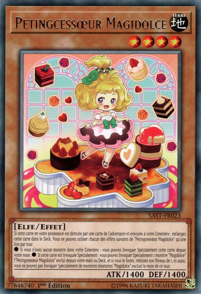 Si cette carte en votre possession est détruite par une carte de l'adversaire et envoyée à votre Cimetière : mélangez cette carte dans le Deck. Vous ne pouvez utiliser chacun des effets suivants de "Petingcessœur Magidolce" qu'une fois par tour. ?Si vous n'avez aucun monstre dans votre Cimetière : vous pouvez Invoquer Spécialement cette carte depuis votre main. ?Si cette carte est Invoquée Spécialement : vous pouvez Invoquer Spécialement 1 monstre "Magidolce" ("Petingcessœur Magidolce" exclu) depuis votre main ou Deck, et si vous le faites, réduisez son Niveau de 1, et aussi, vous ne pouvez pas Invoquer Spécialement de monstres (monstres "Magidolce" exclus) le reste de ce tour.