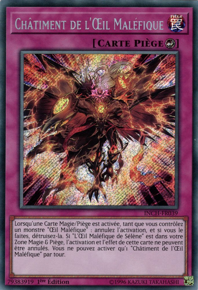 Lorsqu'une Carte Magie/Piège est activée, tant que vous contrôlez un monstre "Œil Maléfique" : annulez l'activation, et si vous le faites, détruisez-la. Si "L'Œil Maléfique de Sélène" est dans votre Zone Magie & Piège, l'activation et l'effet de cette carte ne peuvent être annulés. Vous ne pouvez activer qu'1 "Châtiment de l'Œil Maléfique" par tour.