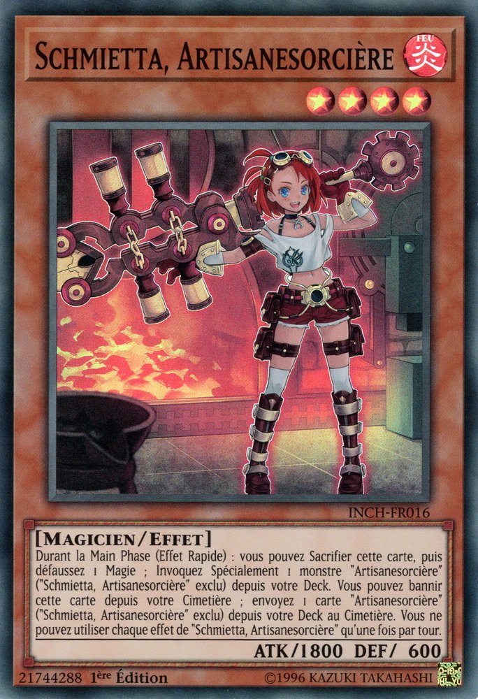 Durant la Main Phase (Effet Rapide) : vous pouvez Sacrifier cette carte, puis défaussez 1 Magie ; Invoquez Spécialement 1 monstre "Artisanesorcière" ("Schmietta, Artisanesorcière" exclu) depuis votre Deck. Vous pouvez bannir cette carte depuis votre Cimetière ; envoyez 1 carte "Artisanesorcière" ("Schmietta, Artisanesorcière" exclu) depuis votre Deck au Cimetière. Vous ne pouvez utiliser chaque effet de "Schmietta, Artisanesorcière" qu'une fois par tour.