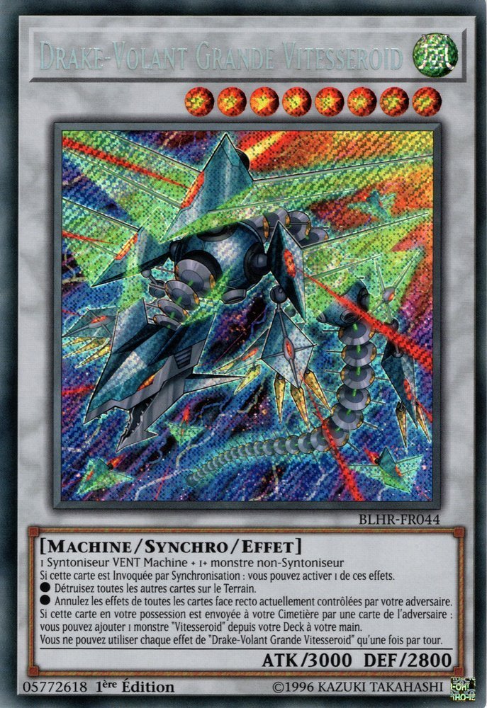 1 Syntoniseur VENT Machine + 1+ monstre non-Syntoniseur Si cette carte est Invoquée par Synchronisation : vous pouvez activer 1 de ces effets. ?Détruisez toutes les autres cartes sur le Terrain. ?Annulez les effets de toutes les cartes face recto actuellement contrôlées par votre adversaire. Si cette carte en votre possession est envoyée à votre Cimetière par une carte de l'adversaire : vous pouvez ajouter 1 monstre "Vitesseroid" depuis votre Deck à votre main. Vous ne pouvez utiliser chaque effet de "Drake-Volant Grande Vitesseroid" qu'une fois par tour.