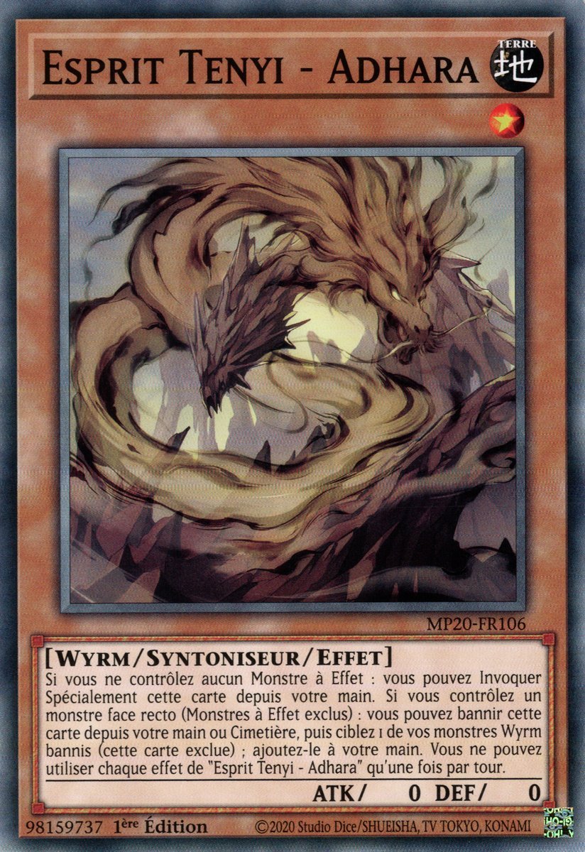 Si vous ne contrôlez aucun Monstre à Effet : vous pouvez Invoquer Spécialement cette carte depuis votre main. Si vous contrôlez un monstre face recto (Monstres à Effet exclus) : vous pouvez bannir cette carte depuis votre main ou Cimetière, puis ciblez 1 de vos monstres Wyrm bannis (cette carte exclue) ; ajoutez-le à votre main. Vous ne pouvez utiliser chaque effet de "Esprit Tenyi - Adhara" qu'une fois par tour.