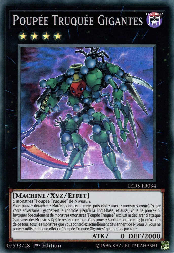 2 monstres "Poupée Truquée" de Niveau 4 Vous pouvez détacher 2 Matériels de cette carte, puis ciblez max. 2 monstres contrôlés par votre adversaire ; gagnez-en le contrôle jusqu'à la End Phase, et aussi, vous ne pouvez ni Invoquer Spécialement de monstres (monstres "Poupée Truquée" exclus) ni déclarer d'attaque (sauf avec des Monstres Xyz) le reste de ce tour. Vous pouvez Sacrifier cette carte ; jusqu'à la fin de ce tour, tous les monstres que vous contrôlez actuellement deviennent de Niveau 8. Vous ne pouvez utiliser chaque effet de "Poupée Truquée Gigantes" qu'une fois par tour.