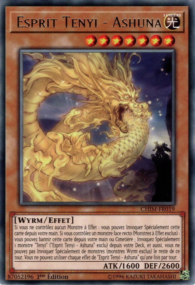Si vous ne contrôlez aucun Monstre à Effet : vous pouvez Invoquer Spécialement cette carte depuis votre main. Si vous contrôlez un monstre face recto (Monstres à Effet exclus) : vous pouvez bannir cette carte depuis votre main ou Cimetière ; Invoquez Spécialement 1 monstre "Tenyi" ("Esprit Tenyi - Ashuna" exclu) depuis votre Deck, et aussi, vous ne pouvez pas Invoquer Spécialement de monstres (monstres Wyrm exclus) le reste de ce tour. Vous ne pouvez utiliser chaque effet de "Esprit Tenyi - Ashuna" qu'une fois par tour.