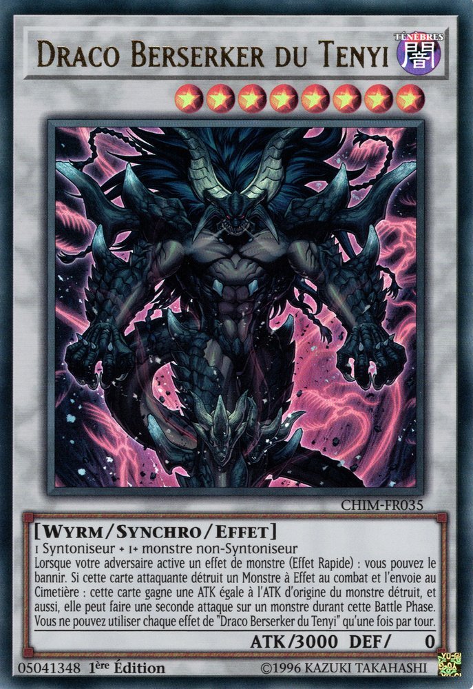 1 Syntoniseur + 1+ monstre non-Syntoniseur Lorsque votre adversaire active un effet de monstre (Effet Rapide) : vous pouvez le bannir. Si cette carte attaquante détruit un Monstre à Effet au combat et l'envoie au Cimetière : cette carte gagne une ATK égale à l'ATK d'origine du monstre détruit, et aussi, elle peut faire une seconde attaque sur un monstre durant cette Battle Phase. Vous ne pouvez utiliser chaque effet de "Draco Berserker du Tenyi" qu'une fois par tour.