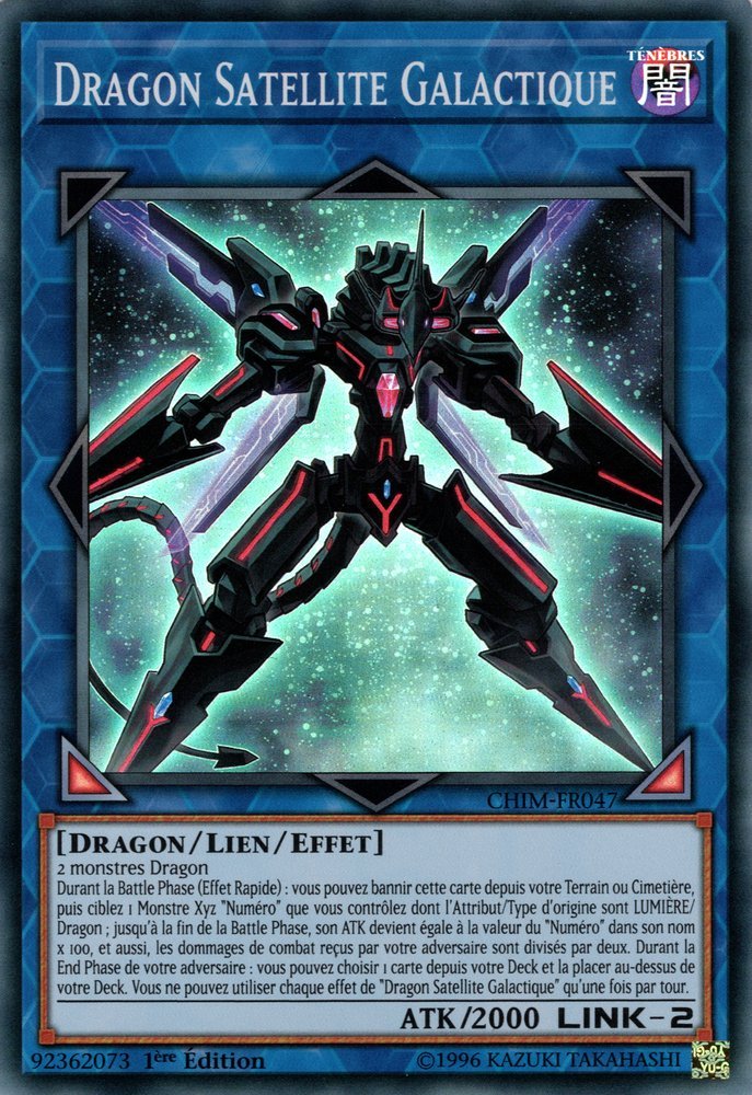 2 monstres Dragon Durant la Battle Phase (Effet Rapide) : vous pouvez bannir cette carte depuis votre Terrain ou Cimetière, puis ciblez 1 Monstre Xyz "Numéro" que vous contrôlez dont l'Attribut/Type d'origine sont LUMIÈRE/Dragon ; jusqu'à la fin de la Battle Phase, son ATK devient égale à la valeur du "Numéro" dans son nom x 100, et aussi, les dommages de combat reçus par votre adversaire sont divisés par deux. Durant la End Phase de votre adversaire : vous pouvez choisir 1 carte depuis votre Deck et la placer au-dessus de votre Deck. Vous ne pouvez utiliser chaque effet de "Dragon Satellite Galactique" qu'une fois par tour.