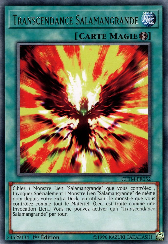 Ciblez 1 Monstre Lien "Salamangrande" que vous contrôlez ; Invoquez Spécialement 1 Monstre Lien "Salamangrande" de même nom depuis votre Extra Deck, en utilisant le monstre que vous contrôlez comme tout le Matériel. (Ceci est traité comme une Invocation Lien.) Vous ne pouvez activer qu'1 "Transcendance Salamangrande" par tour.
