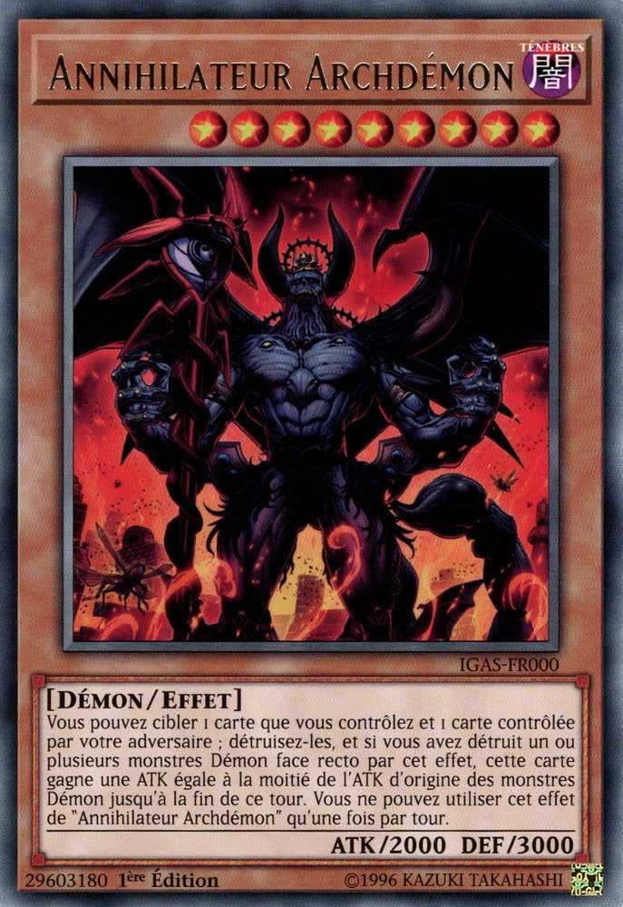 Vous pouvez cibler 1 carte que vous contrôlez et 1 carte contrôlée par votre adversaire ; détruisez-les, et si vous avez détruit un ou plusieurs monstres Démon face recto par cet effet, cette carte gagne une ATK égale à la moitié de l'ATK d'origine des monstres Démon jusqu'à la fin de ce tour. Vous ne pouvez utiliser cet effet de "Annihilateur Archdémon" qu'une fois par tour.