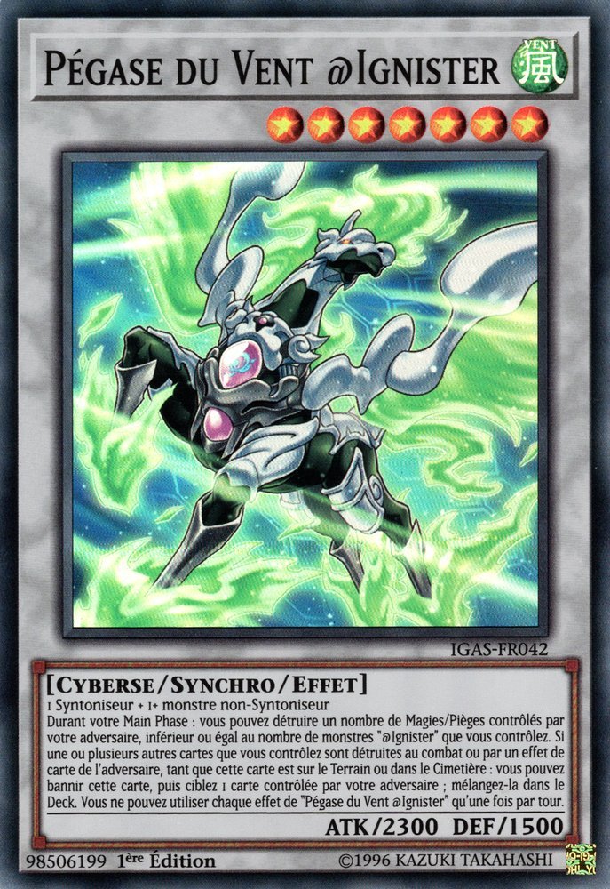 1 Syntoniseur + 1+ monstre non-Syntoniseur Durant votre Main Phase : vous pouvez détruire un nombre de Magies/Pièges contrôlés par votre adversaire, inférieur ou égal au nombre de monstres "@Ignister" que vous contrôlez. Si une ou plusieurs autres cartes que vous contrôlez sont détruites au combat ou par un effet de carte de l'adversaire, tant que cette carte est sur le Terrain ou dans le Cimetière : vous pouvez bannir cette carte, puis ciblez 1 carte contrôlée par votre adversaire ; mélangez-la dans le Deck. Vous ne pouvez utiliser chaque effet de "Pégase du Vent @Ignister" qu'une fois par tour.