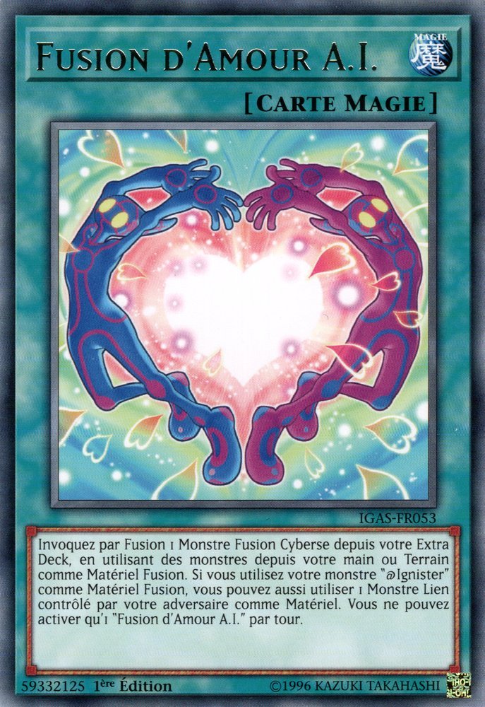 Invoquez par Fusion 1 Monstre Fusion Cyberse depuis votre Extra Deck, en utilisant des monstres depuis votre main ou Terrain comme Matériel Fusion. Si vous utilisez votre monstre "@Ignister" comme Matériel Fusion, vous pouvez aussi utiliser 1 Monstre Lien contrôlé par votre adversaire comme Matériel. Vous ne pouvez activer qu'1 "Fusion d'Amour A.I." par tour.