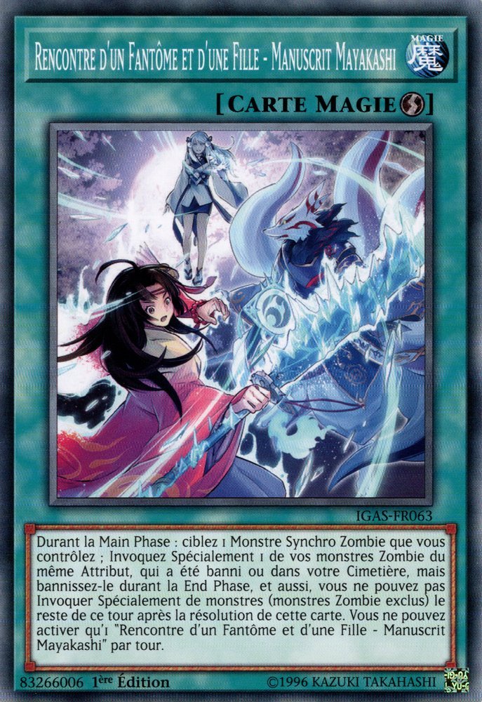 Durant la Main Phase : ciblez 1 Monstre Synchro Zombie que vous contrôlez ; Invoquez Spécialement 1 de vos monstres Zombie du même Attribut, qui a été banni ou dans votre Cimetière, mais bannissez-le durant la End Phase, et aussi, vous ne pouvez pas Invoquer Spécialement de monstres (monstres Zombie exclus) le reste de ce tour après la résolution de cette carte. Vous ne pouvez activer qu'1 "Rencontre d'un Fantôme et d'une Fille - Manuscrit Mayakashi" par tour.