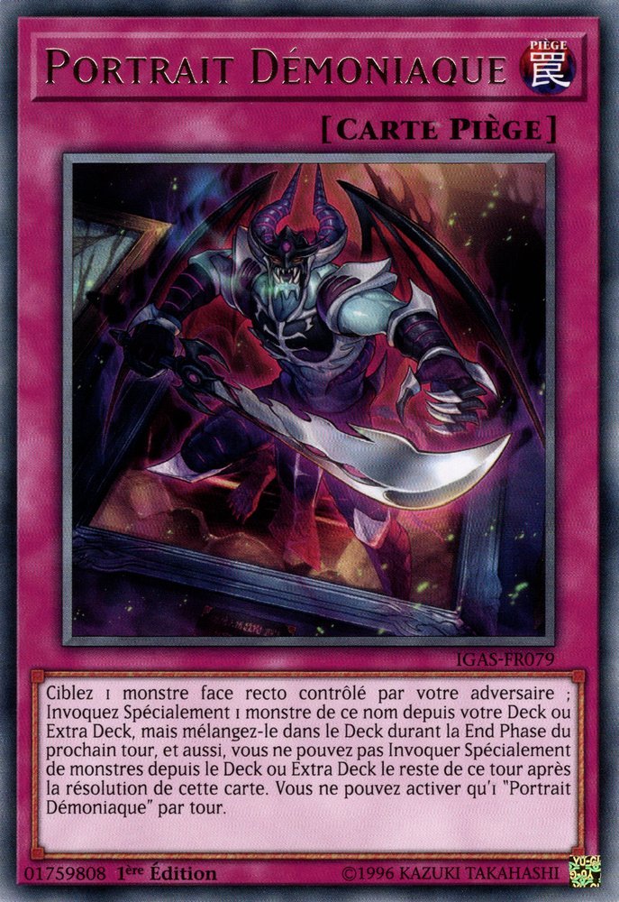 Ciblez 1 monstre face recto contrôlé par votre adversaire ; Invoquez Spécialement 1 monstre de ce nom depuis votre Deck ou Extra Deck, mais mélangez-le dans le Deck durant la End Phase du prochain tour, et aussi, vous ne pouvez pas Invoquer Spécialement de monstres depuis le Deck ou Extra Deck le reste de ce tour après la résolution de cette carte. Vous ne pouvez activer qu'1 "Portrait Démoniaque" par tour.