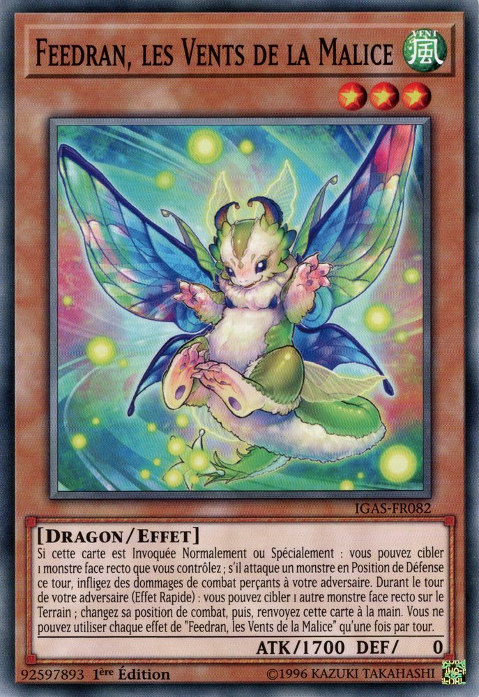 Si cette carte est Invoquée Normalement ou Spécialement : vous pouvez cibler 1 monstre face recto que vous contrôlez ; s'il attaque un monstre en Position de Défense ce tour, infligez des dommages de combat perçants à votre adversaire. Durant le tour de votre adversaire (Effet Rapide) : vous pouvez cibler 1 autre monstre face recto sur le Terrain ; changez sa position de combat, puis, renvoyez cette carte à la main. Vous ne pouvez utiliser chaque effet de "Feedran, les Vents de la Malice" qu'une fois par tour.