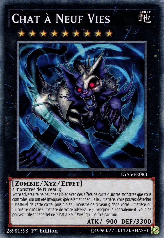 2 monstres de Niveau 9 Votre adversaire ne peut pas cibler avec des effets de carte d'autres monstres que vous contrôlez, qui ont été Invoqués Spécialement depuis le Cimetière. Vous pouvez détacher 1 Matériel de cette carte, puis ciblez 1 monstre de Niveau 9 dans votre Cimetière ou 1 monstre dans le Cimetière de votre adversaire ; Invoquez-le Spécialement. Vous ne pouvez utiliser cet effet de "Chat à Neuf Vies" qu'une fois par tour.