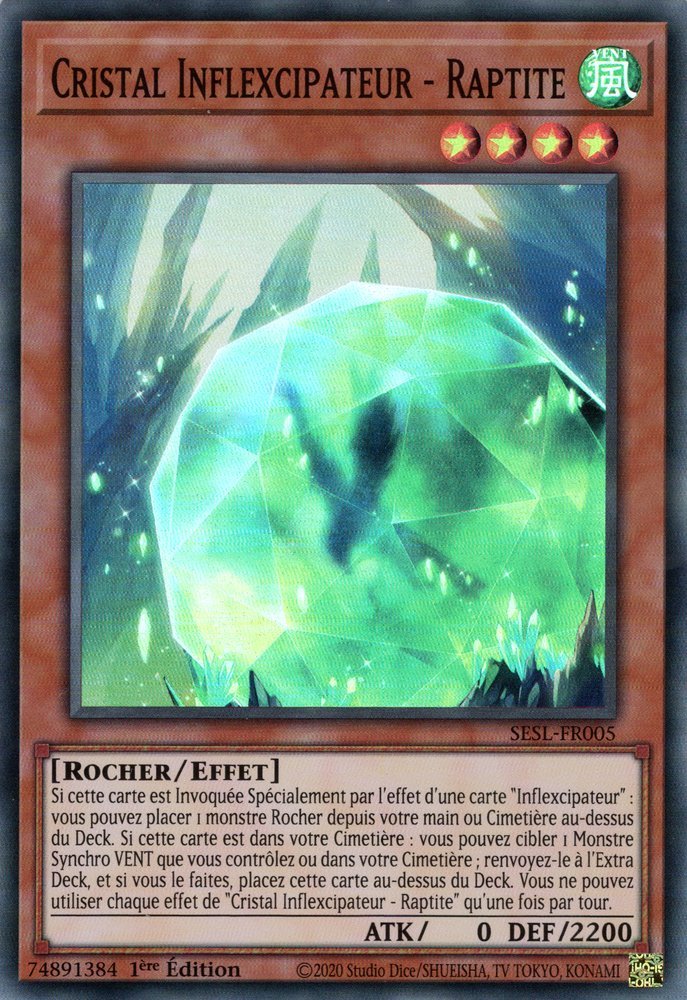 Si cette carte est Invoquée Spécialement par l'effet d'une carte "Inflexcipateur" : vous pouvez placer 1 monstre Rocher depuis votre main ou Cimetière au-dessus du Deck. Si cette carte est dans votre Cimetière : vous pouvez cibler 1 Monstre Synchro VENT que vous contrôlez ou dans votre Cimetière ; renvoyez-le à l'Extra Deck, et si vous le faites, placez cette carte au-dessus du Deck. Vous ne pouvez utiliser chaque effet de "Cristal Inflexcipateur - Raptite" qu'une fois par tour.