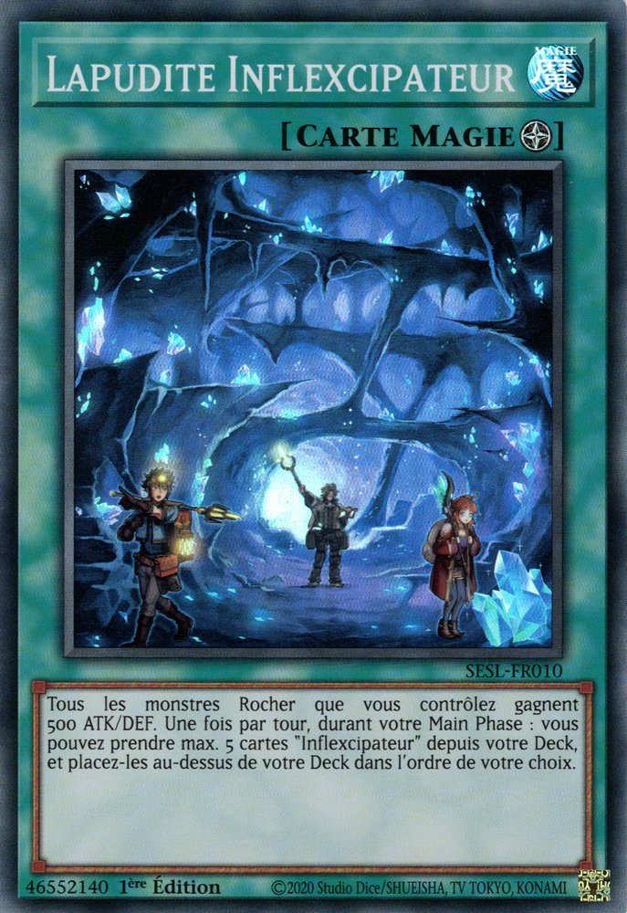Tous les monstres Rocher que vous contrôlez gagnent 500 ATK/DEF. Une fois par tour, durant votre Main Phase : vous pouvez prendre max. 5 cartes "Inflexcipateur" depuis votre Deck, et placez-les au-dessus de votre Deck dans l'ordre de votre choix.