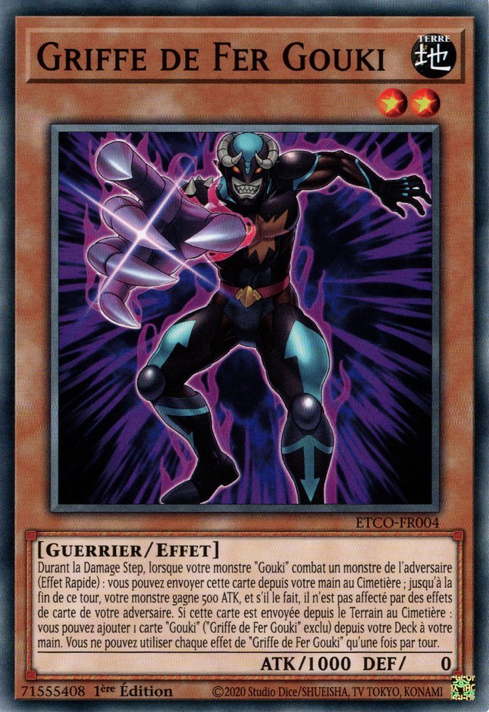 Durant la Damage Step, lorsque votre monstre "Gouki" combat un monstre de l'adversaire (Effet Rapide) : vous pouvez envoyer cette carte depuis votre main au Cimetière ; jusqu'à la fin de ce tour, votre monstre gagne 500 ATK, et s'il le fait, il n'est pas affecté par des effets de carte de votre adversaire. Si cette carte est envoyée depuis le Terrain au Cimetière : vous pouvez ajouter 1 carte "Gouki" ("Griffe de Fer Gouki" exclu) depuis votre Deck à votre main. Vous ne pouvez utiliser chaque effet de "Griffe de Fer Gouki" qu'une fois par tour.
