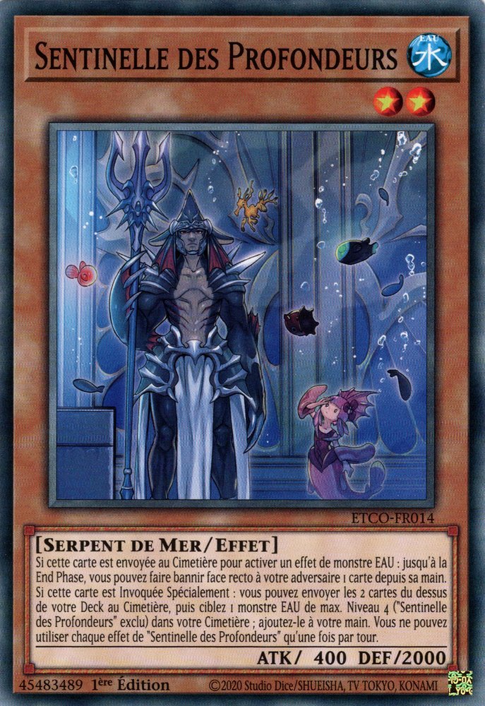 Si cette carte est envoyée au Cimetière pour activer un effet de monstre EAU : jusqu'à la End Phase, vous pouvez faire bannir face recto à votre adversaire 1 carte depuis sa main. Si cette carte est Invoquée Spécialement : vous pouvez envoyer les 2 cartes du dessus de votre Deck au Cimetière, puis ciblez 1 monstre EAU de max. Niveau 4 ("Sentinelle des Profondeurs" exclu) dans votre Cimetière ; ajoutez-le à votre main. Vous ne pouvez utiliser chaque effet de "Sentinelle des Profondeurs" qu'une fois par tour.