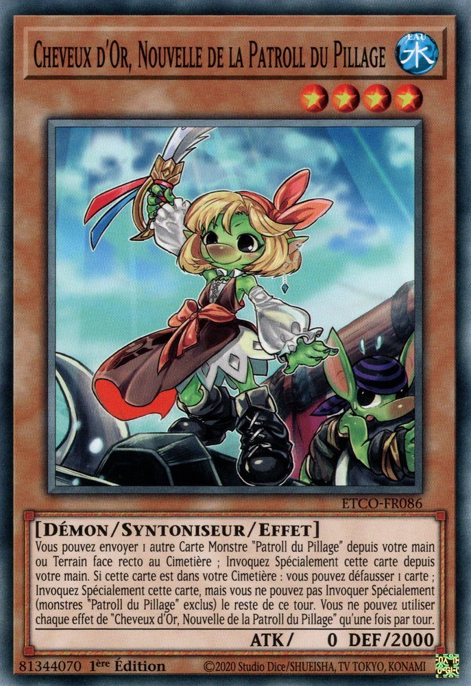 Vous pouvez envoyer 1 autre Carte Monstre "Patroll du Pillage" depuis votre main ou Terrain face recto au Cimetière ; Invoquez Spécialement cette carte depuis votre main. Si cette carte est dans votre Cimetière : vous pouvez défausser 1 carte ; Invoquez Spécialement cette carte, mais vous ne pouvez pas Invoquer Spécialement (monstres "Patroll du Pillage" exclus) le reste de ce tour. Vous ne pouvez utiliser chaque effet de "Cheveux d'Or, Nouvelle de la Patroll du Pillage" qu'une fois par tour.