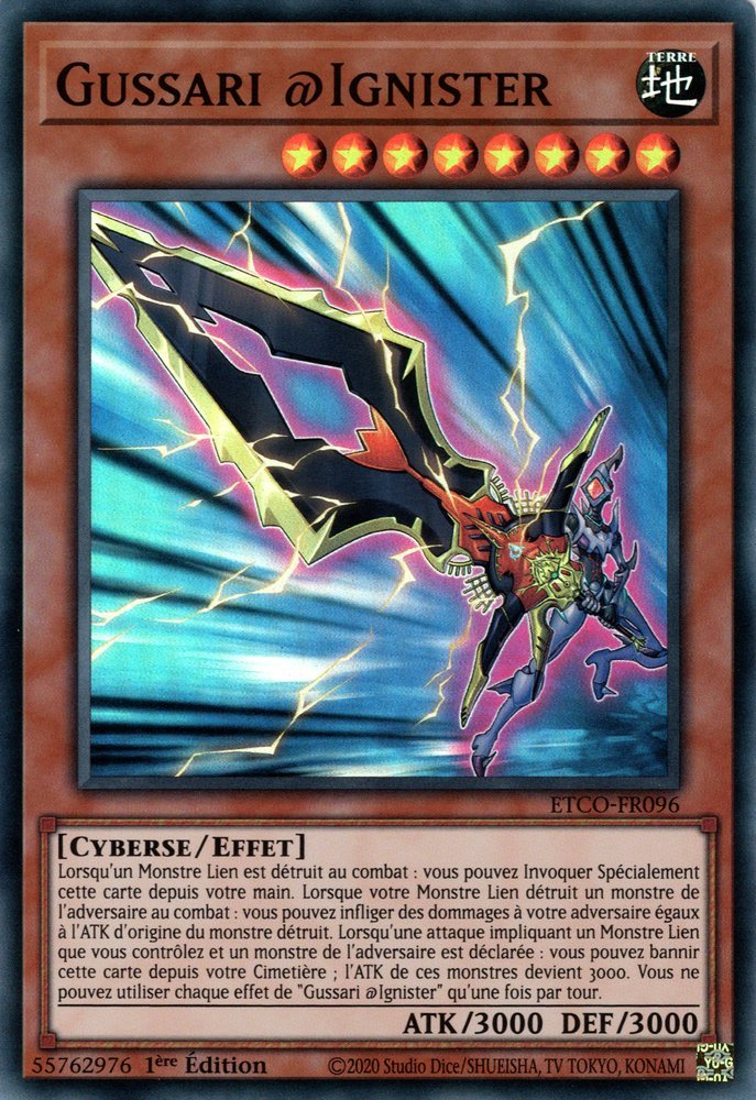 Lorsqu'un Monstre Lien est détruit au combat : vous pouvez Invoquer Spécialement cette carte depuis votre main. Lorsque votre Monstre Lien détruit un monstre de l'adversaire au combat : vous pouvez infliger des dommages à votre adversaire égaux à l'ATK d'origine du monstre détruit. Lorsqu'une attaque impliquant un Monstre Lien que vous contrôlez et un monstre de l'adversaire est déclarée : vous pouvez bannir cette carte depuis votre Cimetière ; l'ATK de ces monstres devient 3000. Vous ne pouvez utiliser chaque effet de "Gussari @Ignister" qu'une fois par tour.