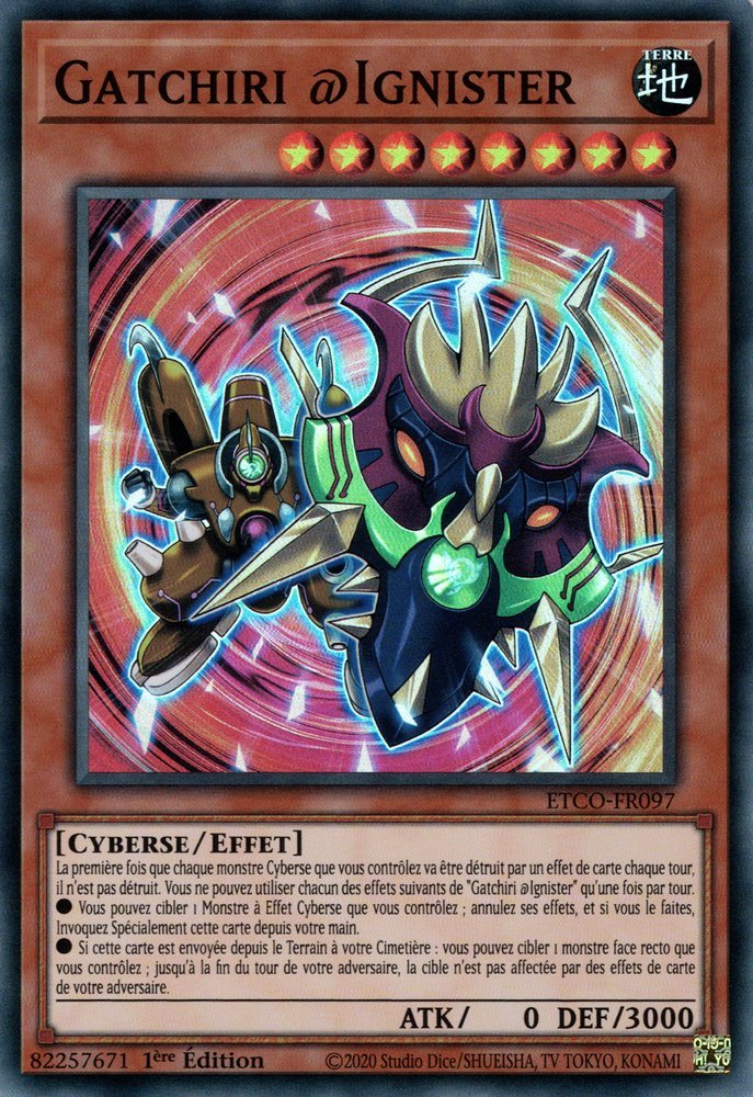 La première fois que chaque monstre Cyberse que vous contrôlez va être détruit par un effet de carte chaque tour, il n'est pas détruit. Vous ne pouvez utiliser chacun des effets suivants de "Gatchiri @Ignister" qu'une fois par tour. • Vous pouvez cibler 1 Monstre à Effet Cyberse que vous contrôlez ; annulez ses effets, et si vous le faites, Invoquez Spécialement cette carte depuis votre main. • Si cette carte est envoyée depuis le Terrain à votre Cimetière : vous pouvez cibler 1 monstre face recto que vous contrôlez ; jusqu'à la fin du tour de votre adversaire, la cible n'est pas affectée par des effets de carte de votre adversaire.