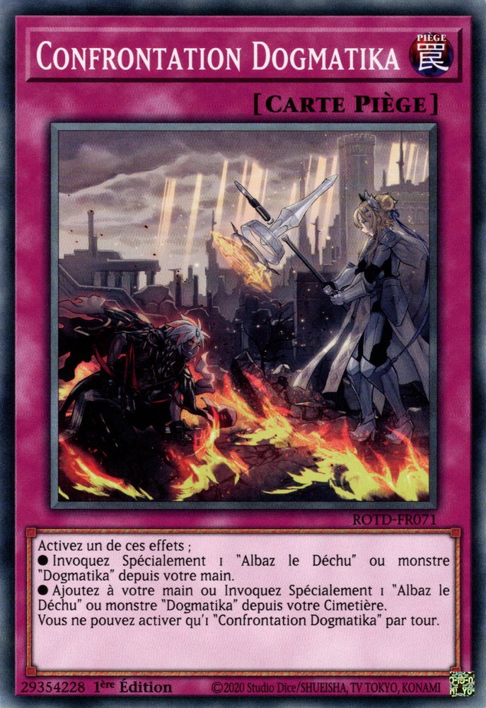 Activez un de ces effets ; • Invoquez Spécialement 1 "Albaz le Déchu" ou monstre "Dogmatika" depuis votre main. • Ajoutez à votre main ou Invoquez Spécialement 1 "Albaz le Déchu" ou monstre "Dogmatika" depuis votre Cimetière. Vous ne pouvez activer qu'1 "Confrontation Dogmatika" par tour.