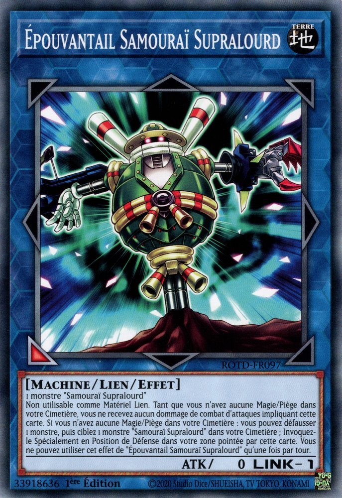 1 monstre "Samouraï Supralourd" Non utilisable comme Matériel Lien. Tant que vous n'avez aucune Magie/Piège dans votre Cimetière, vous ne recevez aucun dommage de combat d'attaques impliquant cette carte. Si vous n'avez aucune Magie/Piège dans votre Cimetière : vous pouvez défausser 1 monstre, puis ciblez 1 monstre "Samouraï Supralourd" dans votre Cimetière ; Invoquez-le Spécialement en Position de Défense dans votre zone pointée par cette carte. Vous ne pouvez utiliser cet effet de "Épouvantail Samouraï Supralourd" qu'une fois par tour.