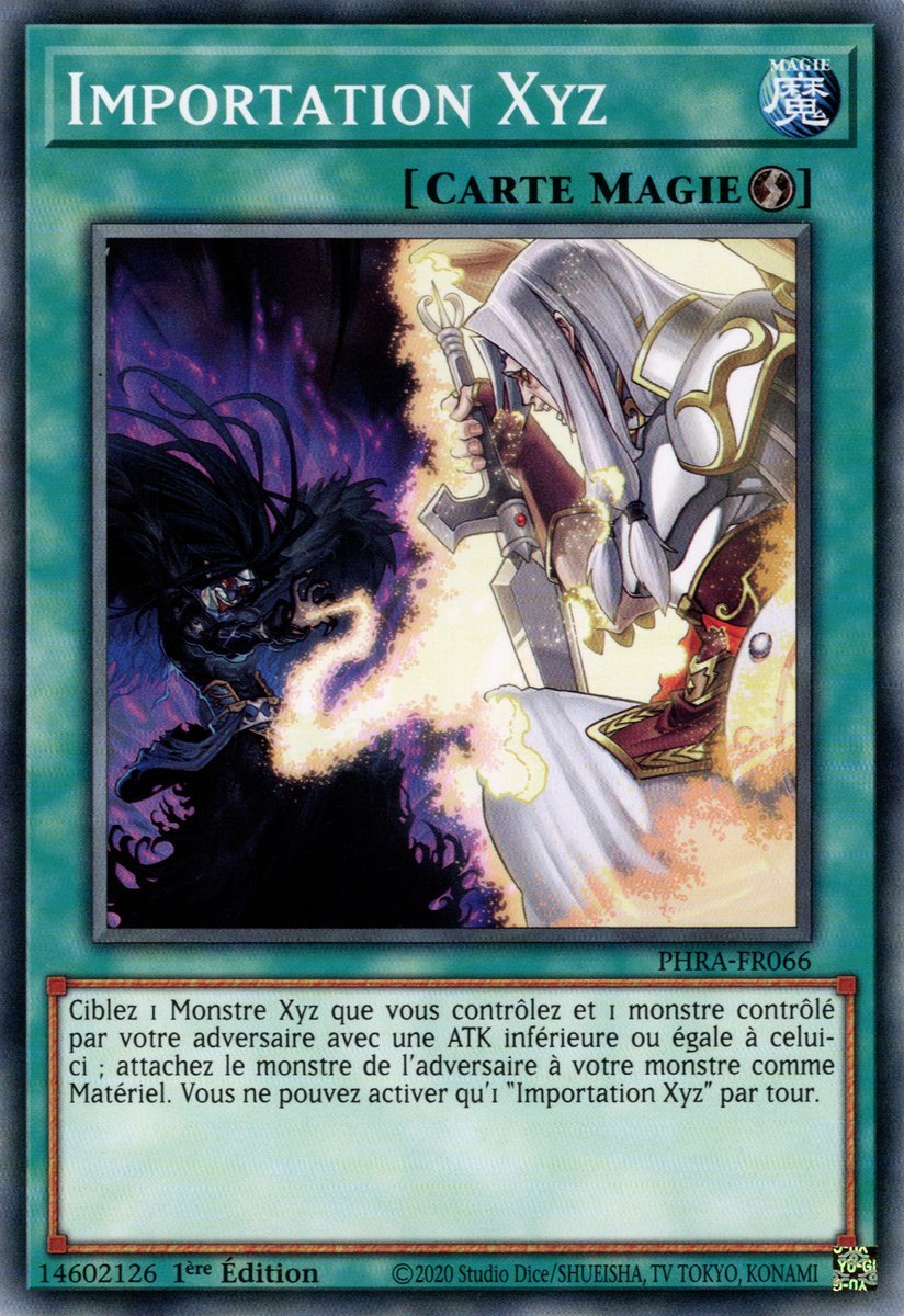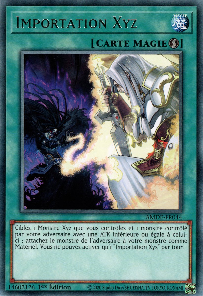 Ciblez 1 Monstre Xyz que vous contrôlez et 1 monstre contrôlé par votre adversaire avec une ATK inférieure ou égale à celui-ci ; attachez le monstre de l'adversaire au monstre que vous contrôlez comme Matériel. Vous ne pouvez activer qu'1 "Importation Xyz" par tour.