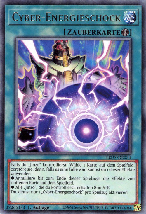 Si vous contrôlez "Jinzo" : ciblez 1 carte sur le Terrain ; détruisez-la, puis, si c'était un Piège, vous pouvez appliquer 1 de ces effets. • Jusqu'à la fin de ce tour, annulez les effets d'1 carte face recto sur le Terrain. • Tous les "Jinzo" que vous contrôlez gagnent 800 ATK. Vous ne pouvez activer qu'1 "Choc Énergétique Cyber" par tour.