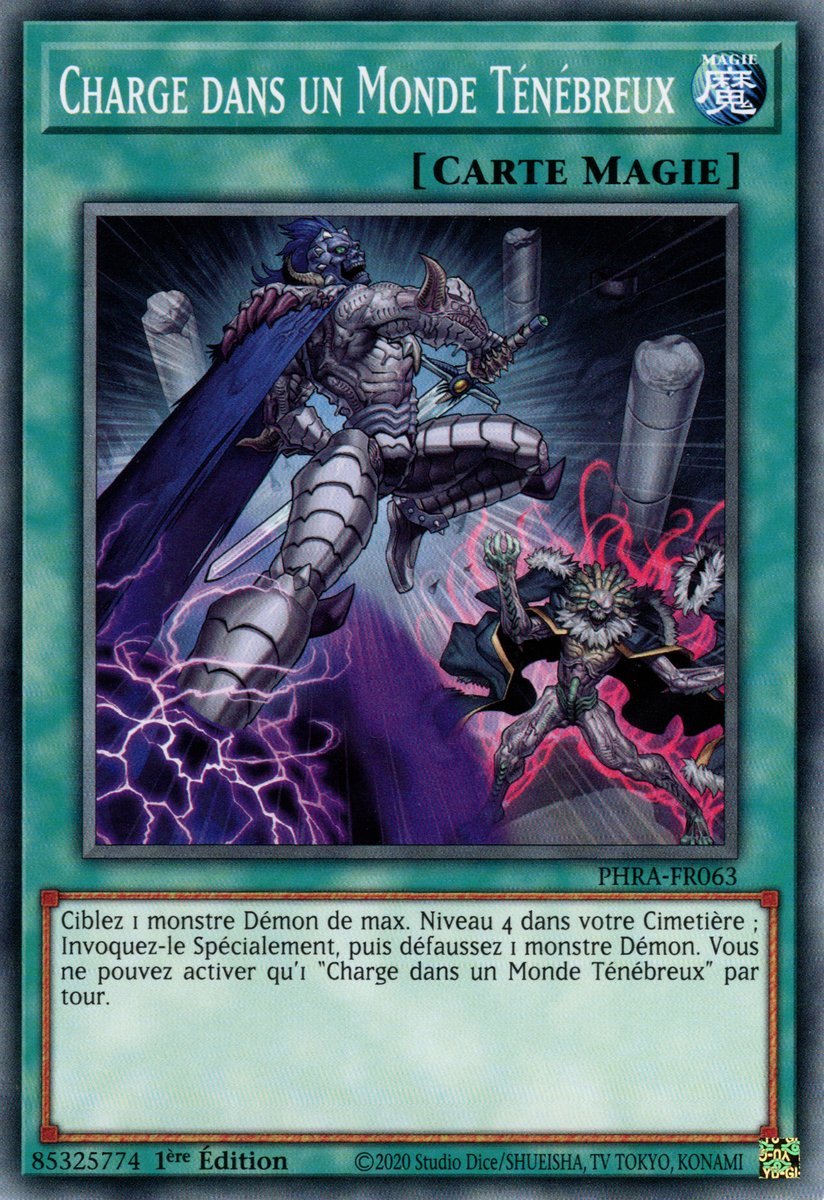 Ciblez 1 monstre Démon de max. Niveau 4 dans votre Cimetière ; Invoquez-le Spécialement, puis défaussez 1 monstre Démon. Vous ne pouvez activer qu'1 "Charge dans un Monde Ténébreux" par tour.