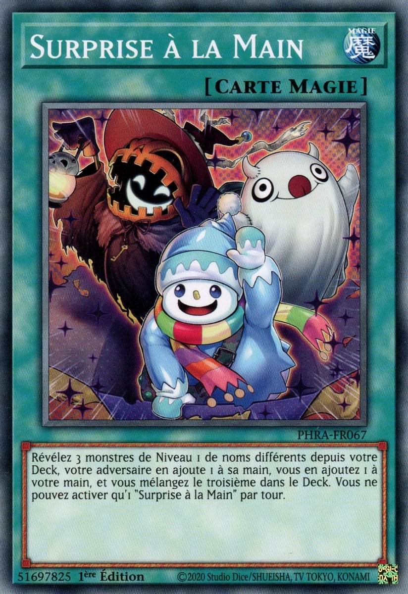 Révélez 3 monstres de Niveau 1 de noms différents depuis votre Deck, votre adversaire en ajoute 1 à sa main, vous en ajoutez 1 à votre main, et vous mélangez le troisième dans le Deck. Vous ne pouvez activer qu'1 "Surprise à la Main" par tour.